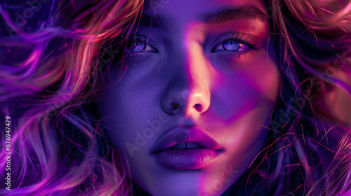 Close-up of the face of a beautiful woman with purple-pink wavy hair and bright makeup. Beauty and fashion concept.