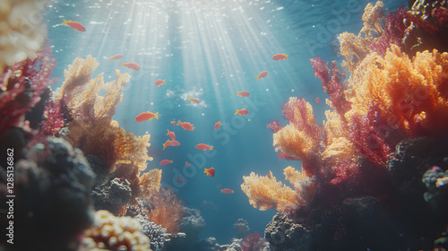 close-up of the sea with vibrant coral, small fish swimming, and sunlight filtering through the water