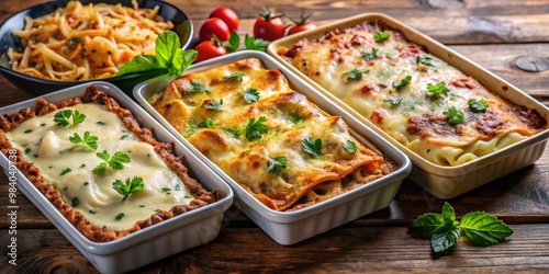 Close-up of Three Elegant White Ceramic Lasagna Dishes on Dark Wooden Table, Topped with Creamy Sauce and Parsley, Surrounded by Red Tomatoes and Basil, Evoking Comfort and Warmth