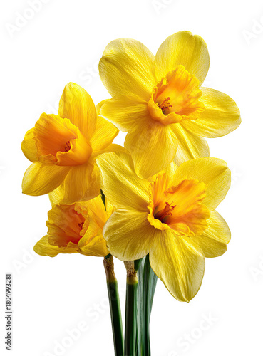 Close-up of three vibrant yellow daffodils. Petals are a rich, golden yellow, with a delicate orange-yellow center. Dark green stems are visible. Isolated against a black background