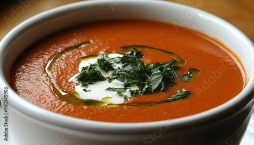 Close-up of Tomato Soup with Cream, Basil, and Olive Oil