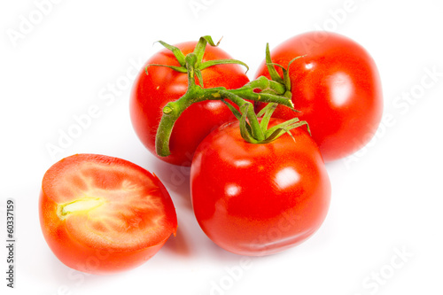 Closeup of tomatoes on the vine isolated on white. Tomato branch