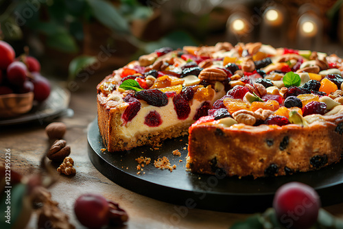 Close-Up of Traditional Fruitcake with Dried Fruits and Nuts on Rustic Surface