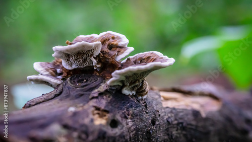 Close-Up of Trametes Versicolor Growing on Dry Logs