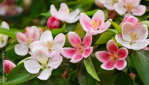 closeup of vibrant pink and white flower blossoms with green leaves in spring