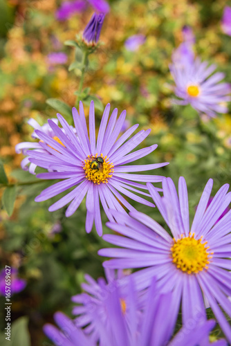 Close-up of vibrant purple aster flowers with yellow centers, blooming in a garden during late summer.