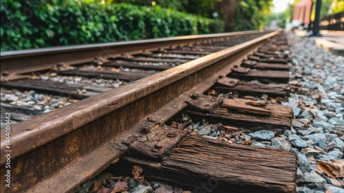 Close-up of weathered train tracks beside lush greenery