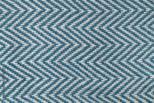 Close-up of white and blue striped cotton fabric. Texture of natural, eco-friendly zigzag textile. Material for a blanket, beach towel, or tablecloth. Abstract background