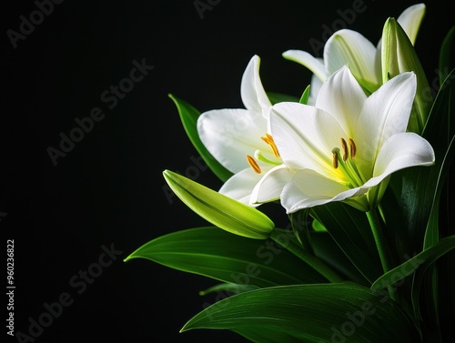 Close-up of white lilies with dark background, highlighting delicate petals and green leaves in a serene composition, perfect for decor and art.