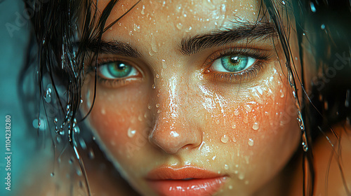 Close-up of young caucasian female with wet hair and bright eyes