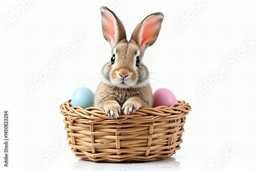 Close-Up Photo of Adorable Easter Bunny in Basket Isolated on Transparent Background