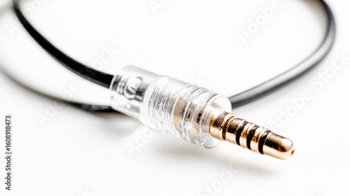 Close-up photo of an audio cable with a male 3.5mm headset jack on a white background, macro photography, studio lighting.