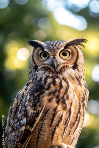 Close-up photo of an owl sitting on a tree branch, looking straight ahead