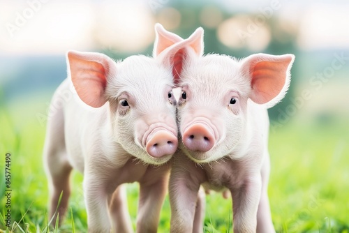 Close-up photo of cute piglets outside in a field, focusing on their expressive eyes and soft pink skin. The background is blurred to highlight the adorable young pigs.