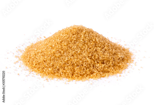 Closeup pile of granulated brown sugar isolated on white background. Unhealthy diet ,awareness and stop diabetes concept.