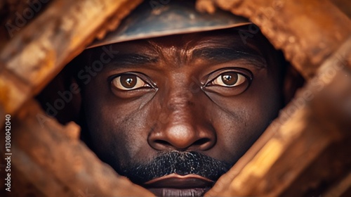 Close-up portrait of a Black man's face, framed by weathered wood.