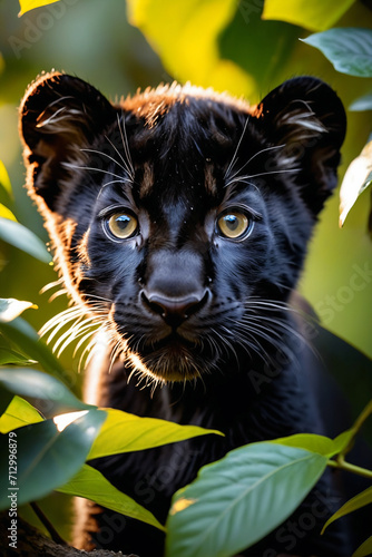 Close-up portrait of a cute panther cub hidden behind the leaves, looking at camera, cinematic light, selective focus, golden backlight
