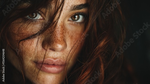 Close-up portrait of a woman with freckles and brown hair