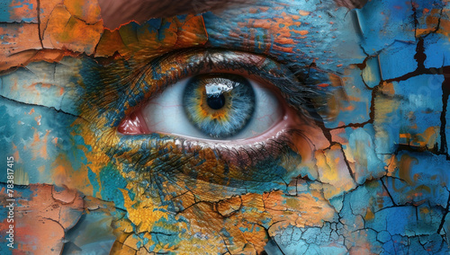 Closeup portrait of a woman's eye with a vibrant and colorful paint splatter, abstract and artistic concept of beauty and creativity