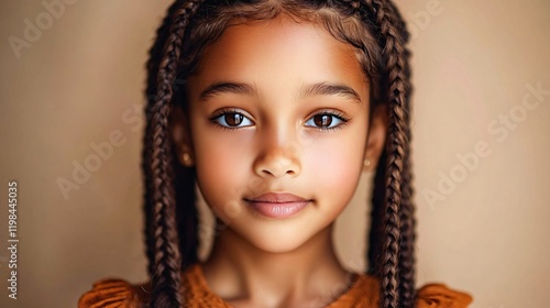 Close-up portrait of a young girl with braided hair, ideal for children's events, beauty campaigns, and social media. Perfect for uplifting marketing materials.