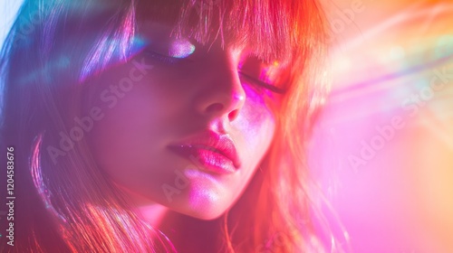 Close-up portrait of a young woman with eyes closed, illuminated by vibrant, multicolored lights.