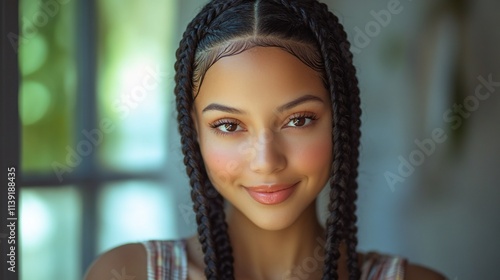 Close-up portrait of a young woman with long braids, smiling gently at the camera.