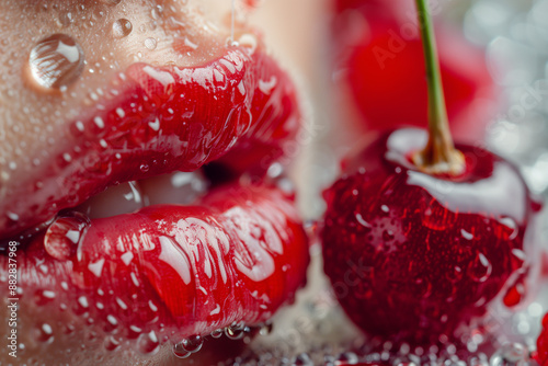 Close-Up Portrait of Beautiful Female Wet Lips with Delicious Cherry, Sensual Allure, Fresh Fruit, Tempting Beauty, Lip Gloss
