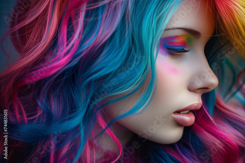 Close-up portrait of beautiful young Caucasian woman with long wavy hair dyed in different neon colors. Charming female model with perfect makeup and multi-color hairstyle. Diversity in fashion.