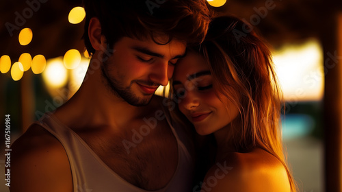 Close-up Portrait of Young Lovely Couple Hugging in Wooden Beach House at Evening Sunset, Enjoying Moment Together with Intimacy under Warm Lights of Setting Sun,