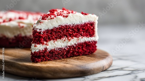 Close-up red velvet cake slice with cream frosting on wooden board.
