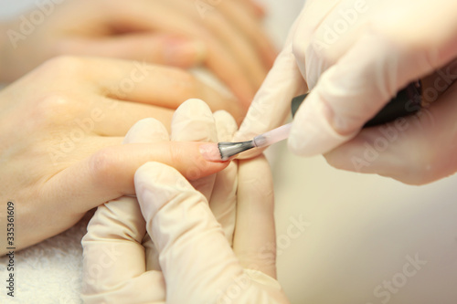Closeup shot of a woman in a nail salon getting a manicure by a cosmetologist with a nail file. Woman gets a manicure of nails. Beautician puts nails on the client.