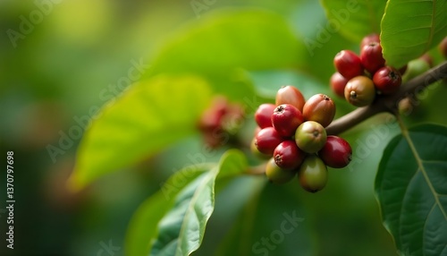 Close-up shot of coffee plants with red and green coffee beans, vibrant green leaves, and a blurred background