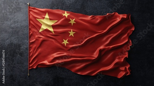 Close-up view of a Chinese national flag waving gently against a dark, textured background