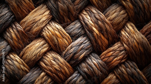 Close-up view of a intricately woven texture with brown and dark brown fibers. The image showcases the detail and craftsmanship of the weave. A Close-Up of Brown and Dark Brown Intertwined Fibers