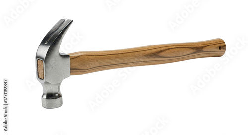 Close-up view of a polished metal claw hammer with a wooden handle isolated on black isolated on transparent background