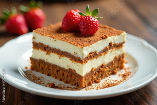 Close-up view of a single serving of tiramisu, showing texture and detail , cocoa, yummy, italian