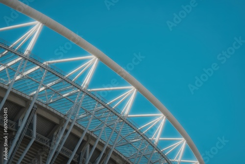 Closeup view of a stadiums white steel structure against a clear blue sky, showcasing its intricate design