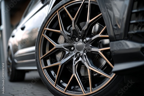 Close-up view of a stylish alloy wheel on a modern SUV parked in an urban setting during late afternoon light
