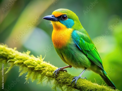 Close-Up View of a Vibrant Green and Yellow Bird Perched on a Branch in Natural Habitat Environment