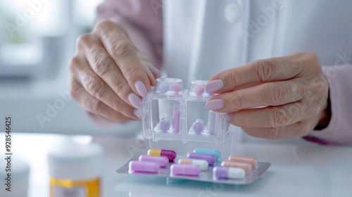 Close-up view of a woman's hand carefully selecting a pill from a weekly pill organizer, promoting health management.