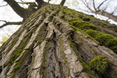 Close-up view of deep grooves on the bark of an ancient oak tree with moss