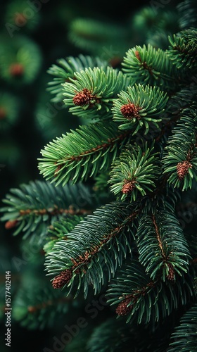 Close-up view of evergreen branches showcasing vibrant green needles and pine cones in a forest setting