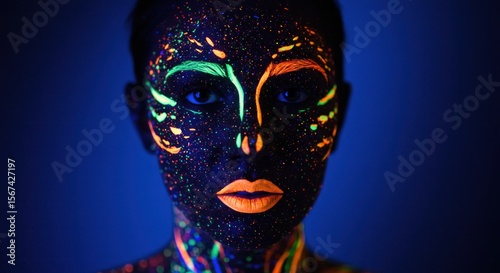 Close-up view of face covered in bright neon fluorescent paint under ultraviolet light glowing