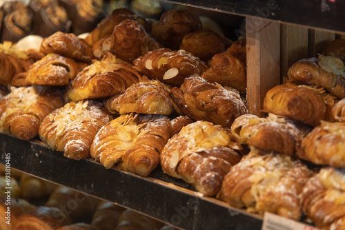 Close-up view of fresh baked brown puff almond croissants lying on shelf in bakery or cafe. Small business. Soft focus. Food background. Pastry theme.