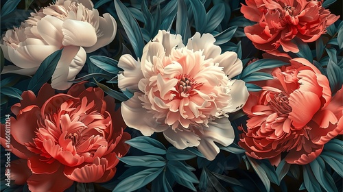 Close-up view of lush peonies in full bloom, showcasing their intricate petals and rich colors