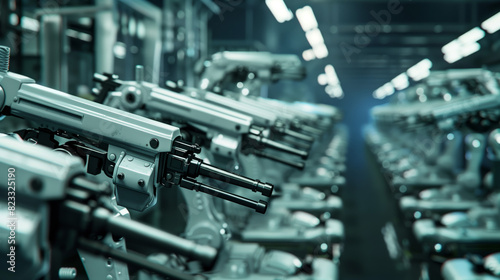 Close-up view of modern anti-aircraft guns lined up on an assembly line in a high-tech factory, showcasing precision engineering and industrial manufacturing processes