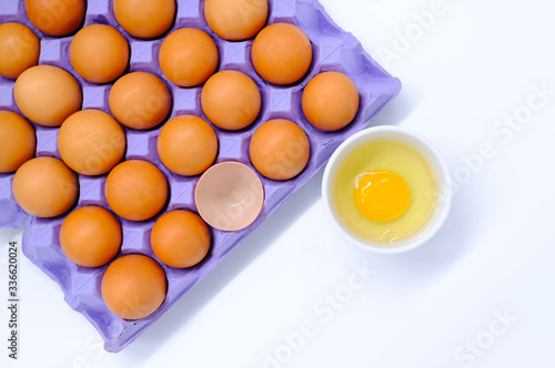 Close-up view of raw chicken eggs in egg box on white background