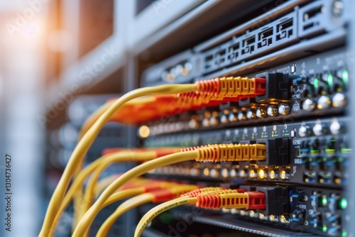 Close-up View of Server Rack with Colorful Ethernet Cables Connected to Networking Equipment in Data Center