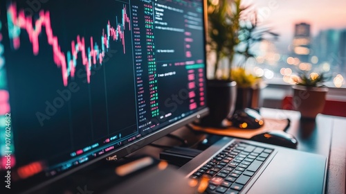 Close-Up View of Stock Market Trading Graphs on a Modern Desktop Computer in a Busy Financial Office Setting During Sunset