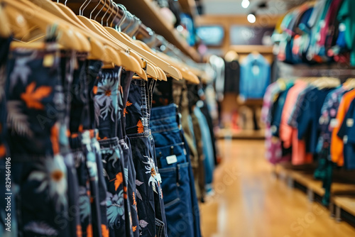 clothing store with pants hanging on hangers, outdoor pants for hiking and trekking in stock in the background. Wearing trousers or jeans at a shopping center